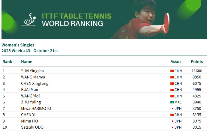 - 乒联排名:孙颖莎连续171周排名第一 国乒包揽女单前五
