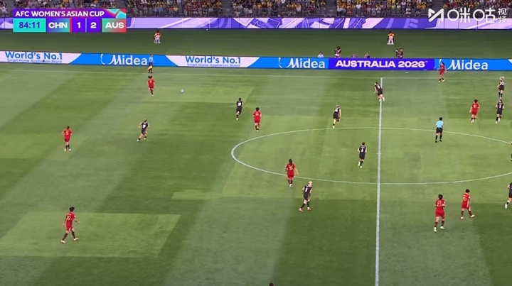 没持久力了!对抗赛第84分钟,吴海燕后防区传中直接传出足草坪边足球场边线