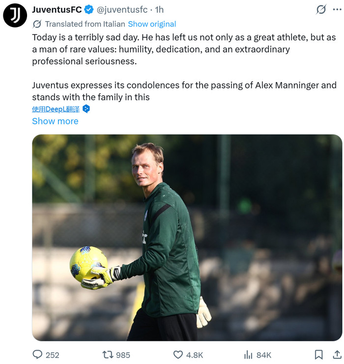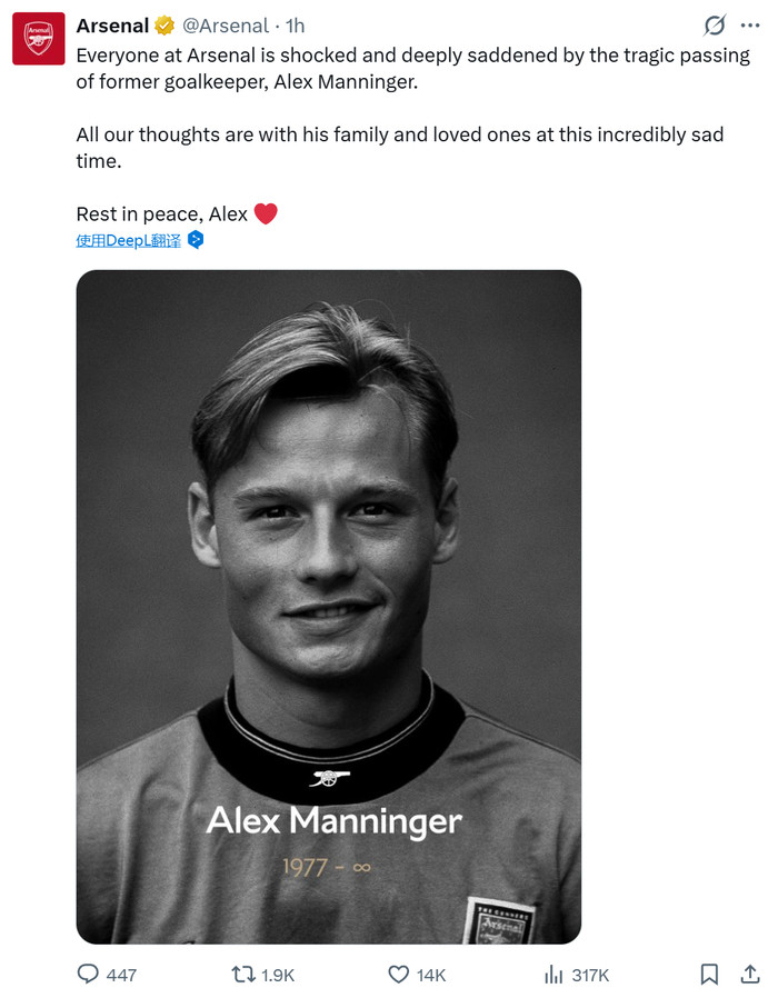 阿森纳、尤文图斯等俱乐部官方社交媒体也相继发文,深切悼念昔日守门员亚历山大·曼宁格的离世。