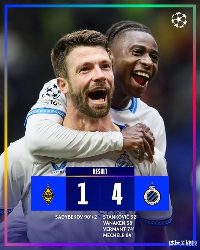 布鲁日在阿斯塔纳客场应战 轻松取胜,拿下自欧冠首个赛事 日后的首场获胜 。客队球员马马杜・迪亚孔的射球 率先击中门柱,第 32 分钟,亚历山大・斯坦科维奇一脚劲射破门,为布鲁日取得领跑 。
