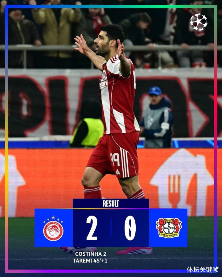 奥林匹亚科斯在比雷埃夫斯主场作战 2-0 击败勒沃库森,拿下队史 14 次对阵德国球队的首场获胜 。