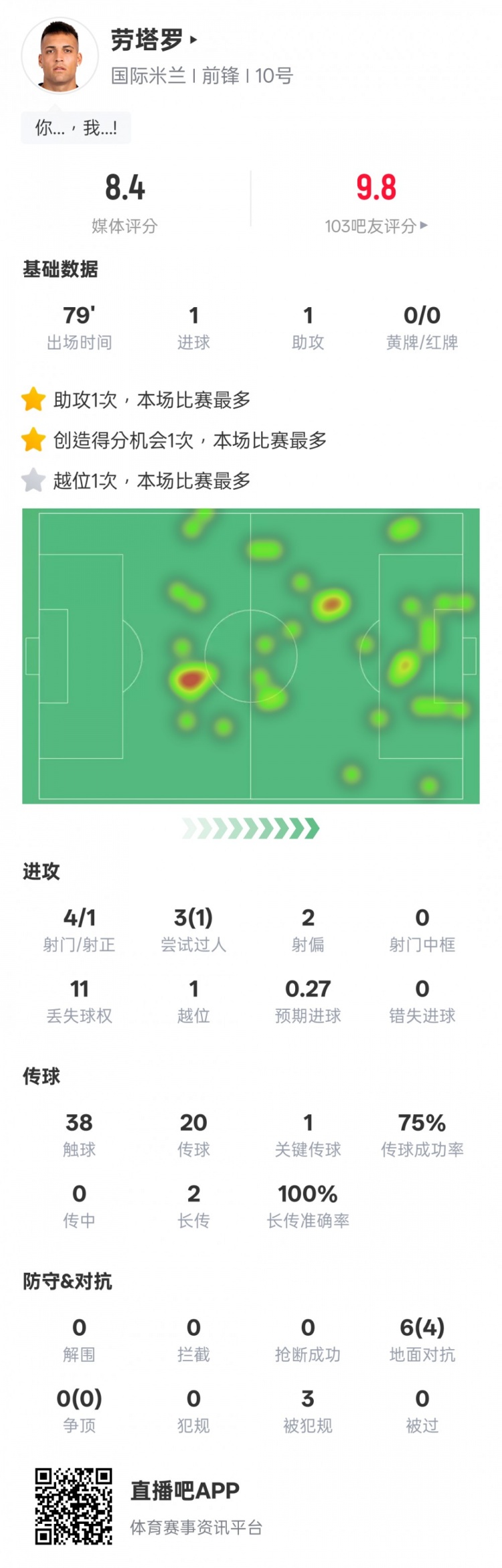 劳塔罗本场数据:1得分 1助功 1关键传送球 ,评分8.4