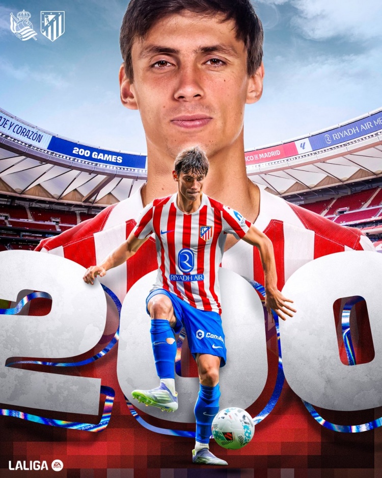 西甲官方发布海报,祝贺马竞后场球员勒诺尔芒迎来西甲200场里程碑
