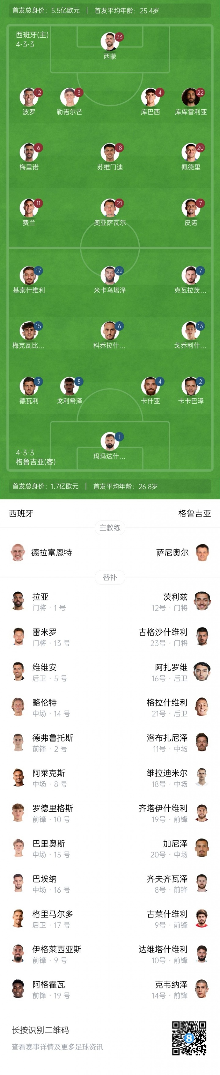西班牙vs格鲁吉亚杆位:佩德里、费兰、梅里诺先发,K77出战