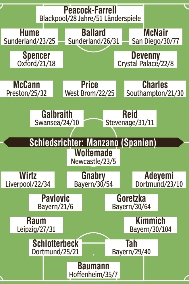 后场球员:劳姆(莱比锡)、施洛特贝克(多特)、若纳坦-塔(拜仁)、基米希(拜仁)
