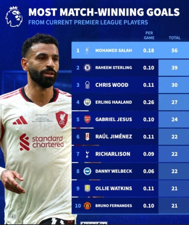 英超现役制胜球球员排行:萨拉赫56球遥遥领跑 ,斯特林39球次之